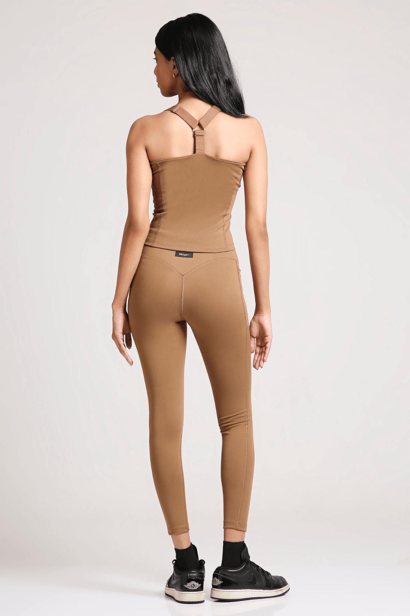 Co-ord Set: Good Girl Code Sports Bra & Cross-Leggings Set in Mountain Tan