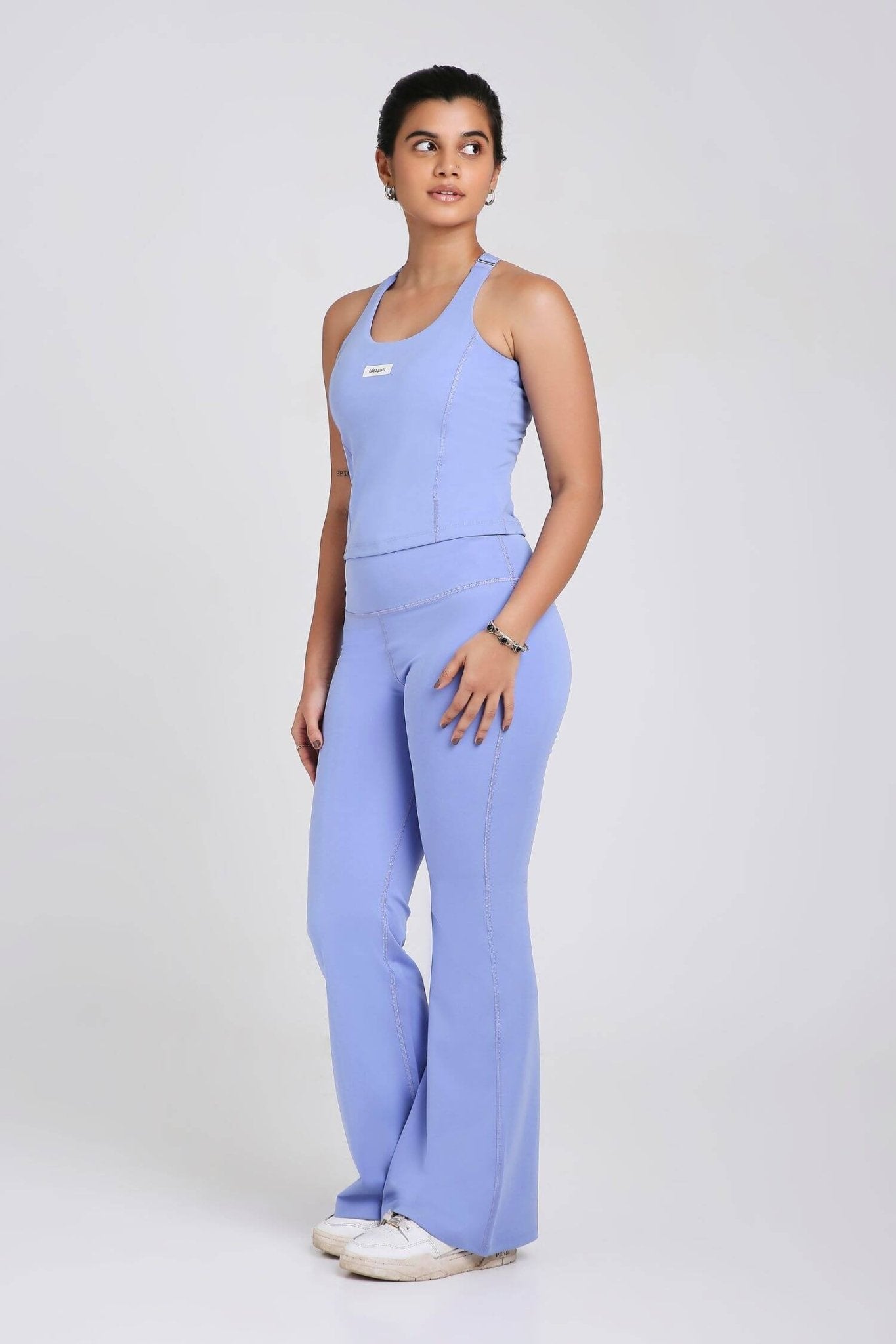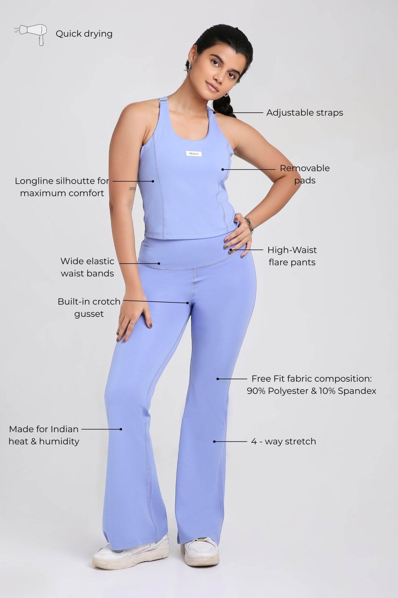 I usually wear flared pants for workout. Any I have from international brands are soft stretchy waist band doesn’t fold and the quality is really good. I was expecting the same when I thought let’s try an Indian brand but honestly my bad. I should have read it’s purely polyester. When I opened the package and felt the pants I immediately knew I’d regret it. It’s not stretchy soft and the waist band slips. It’s cute guaranteed the set is pretty and the sizing is fine but I immediately regretted buying it because it’s just polyester.