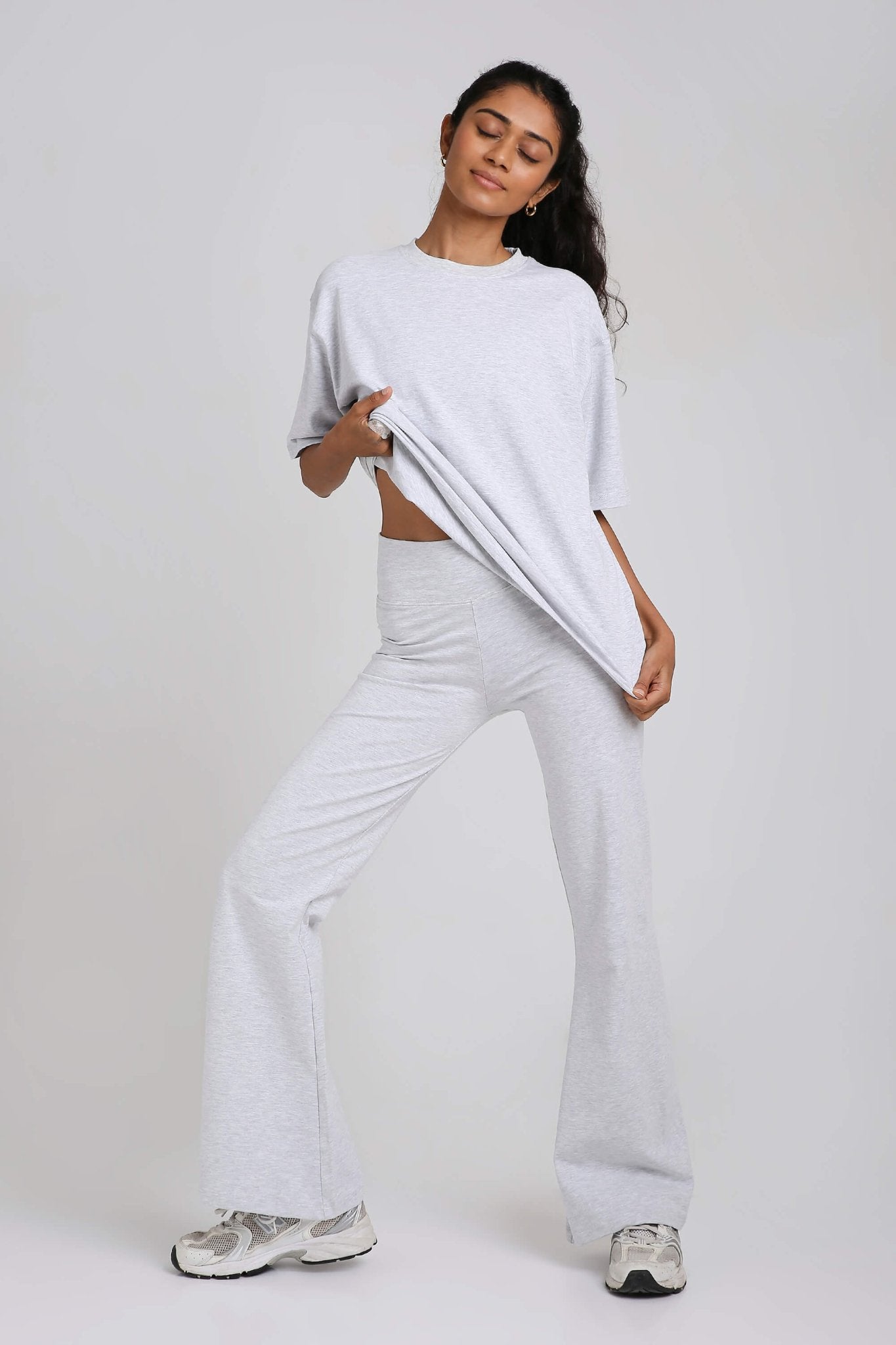 We wanted a matching set you could actually live in - one that works for yoga, travel, errands, and even last-minute dinner plans. This pairing brings together our Oversized Tee and Chill Flares, both made from our breathable cotton SnugLife fabric with 4-way stretch. The fabric is tested for 3000 wears and finished with a silicone biowash so it feels softer, smoother, and stays fresh no matter how much you wear it.