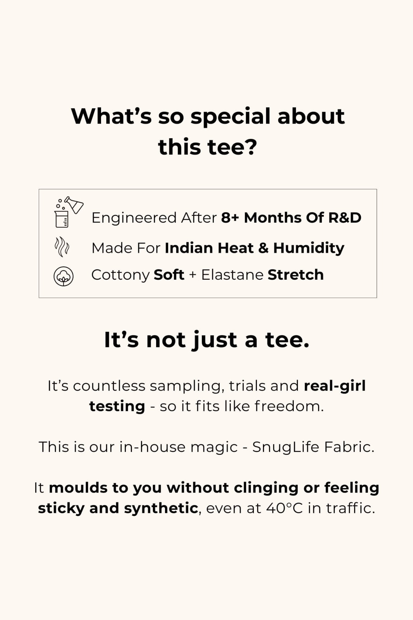 We wanted a top that felt like your favourite old tee but looked way more put-together. So we spent 12+ months developing SnugLife Fabric - because soft just wasn’t soft enough. It had to survive Indian summers, stretch with you, and feel like a COMFY hug without the sweat.