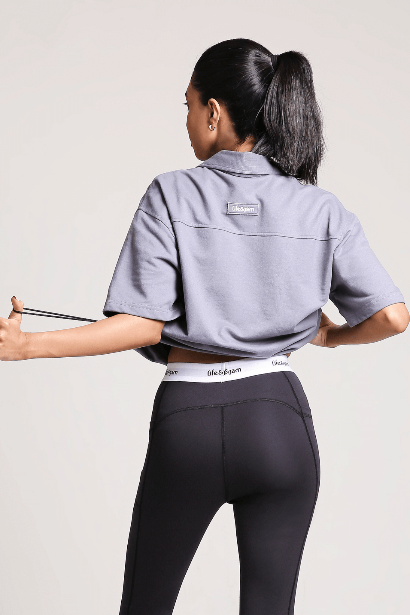 The Hybrid Polo Tee features a bottom metal adjuster at the waistband, allowing you to cinch the tee for a cropped, fitted look or loosen it for a relaxed, casual fit. It’s versatile and customizable for different styling preferences.