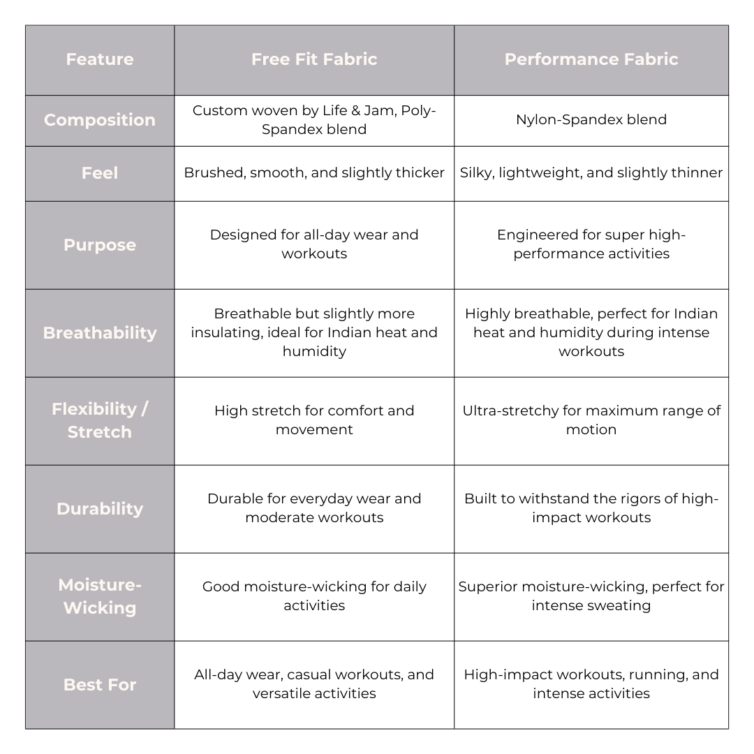 What is the difference between the Free Fit Fabric and the Performance Fabric?