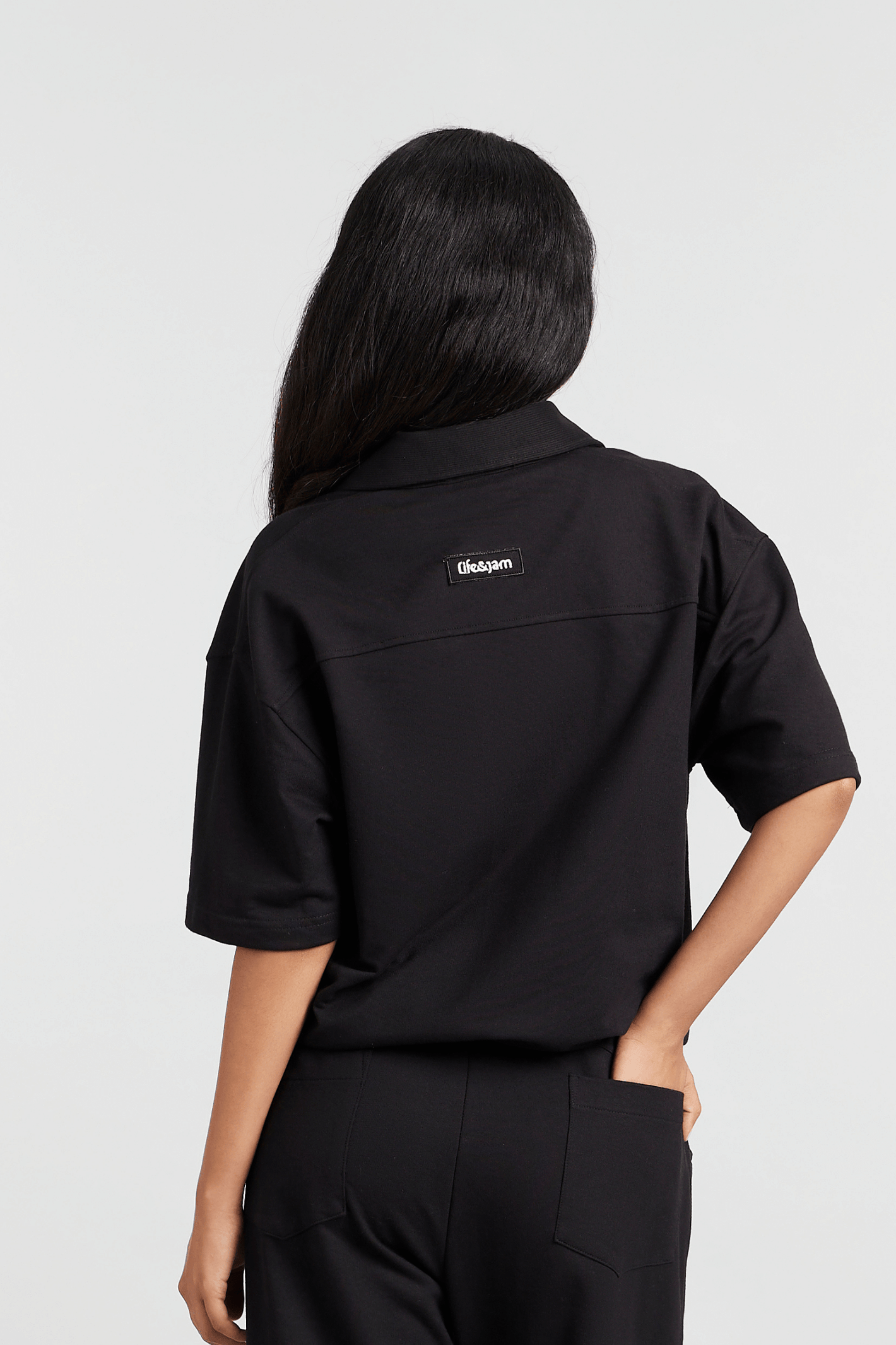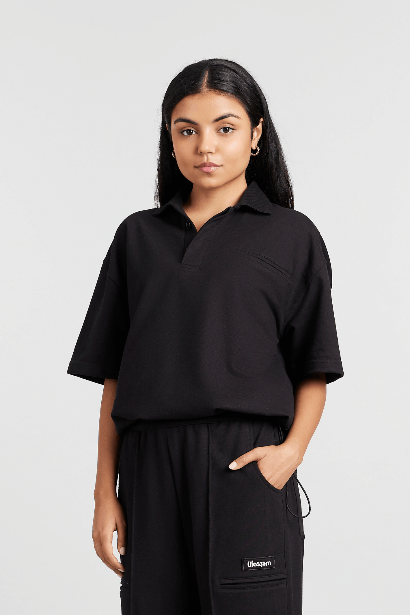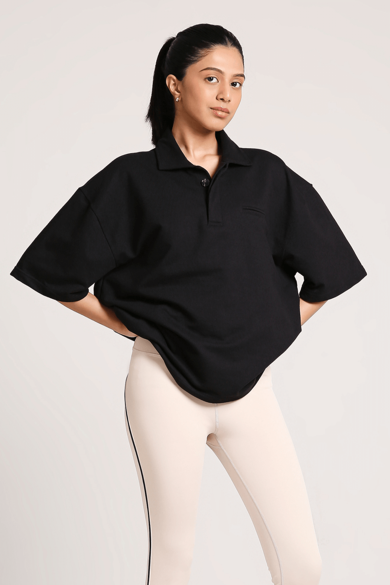 Why You NEED This: The True Black Hybrid Polo Tee is a versatile essential, blending classic style with modern functionality. With a relaxed fit and sleek polo collar, this tee stands out with a convertible metal waist adjuster that allows for a cinched, cropped look when you want to switch things up. Perfect for creating a polished yet casual vibe, this tee is a wardrobe must-have for any occasion.